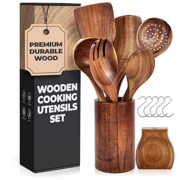 耐用柚木防粘掛鉤托盤組 100%天然廚房木製烹飪用具
